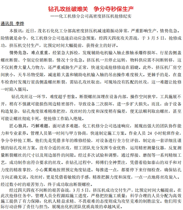 化工機修分公司高密度擠壓機搶修紀實