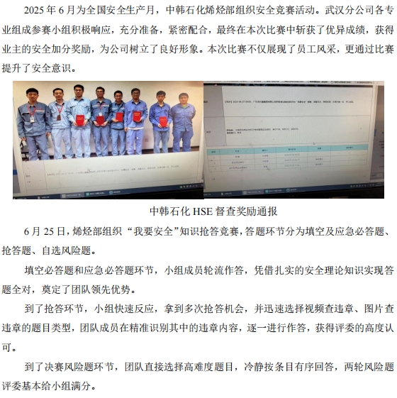 武漢分公司參加烯烴安全知識(shí)競(jìng)賽獲獎(jiǎng)勵(lì)